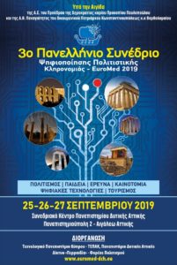 Τέλος ,σημειώνεται ότι ξεκίνησαν οι εγγραφές για το 3ο Συνέδριο Ψηφιοποίησης Πολιτιστικής Κληρονομιάς -EuroMed 2019 , που διοργανώνεται στην Ελλάδα κάθε δύο (2) χρόνια, μέσα από το επίσημο site http://www.euromed-dch.eu, και που, φέτος , θα φιλοξενηθεί από το Πανεπιστήμιο Δυτικής Αττικής (Πανεπιστημιούπολη 2) και τελεί, για μια ακόμα φορά, υπό την Αιγίδα της Α.Ε. του Προέδρου της Δημοκρατίας κυρίου Προκοπίου Παυλοπούλου και της Α.Θ. Παναγιότητος του Οικουμενικού Πατριάρχου Κωνσταντινουπόλεως κ.κ. Βαρθολομαίου , ενώ υποστηρίζεται από πολλά Υπουργεία Ελλάδας και Κύπρου και πολλούς παγκόσμιους επιστημονικούς Οργανισμούς.